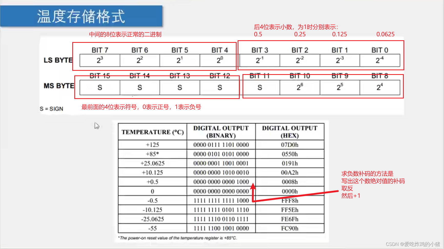 在这里LS BYTE(TMSB)表示低位而MS BYTE(TLSB)表示低位,Temp=(TMSB<<8)|TLSB