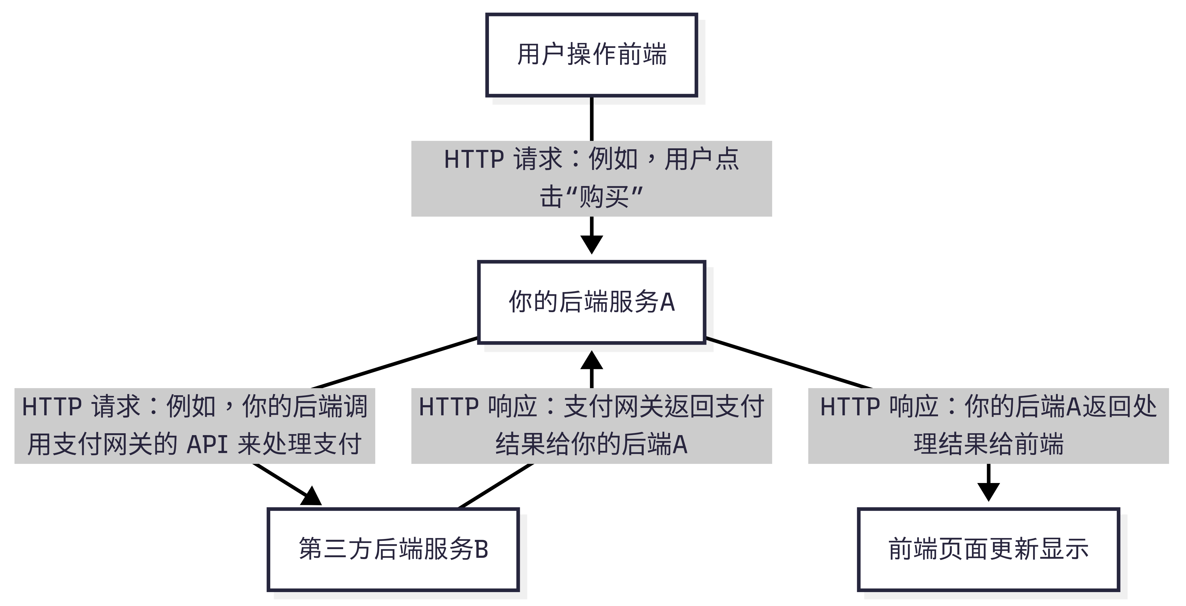 - 在常规调用中,你的后端服务 A 调用的是支付网关的 API 端点。