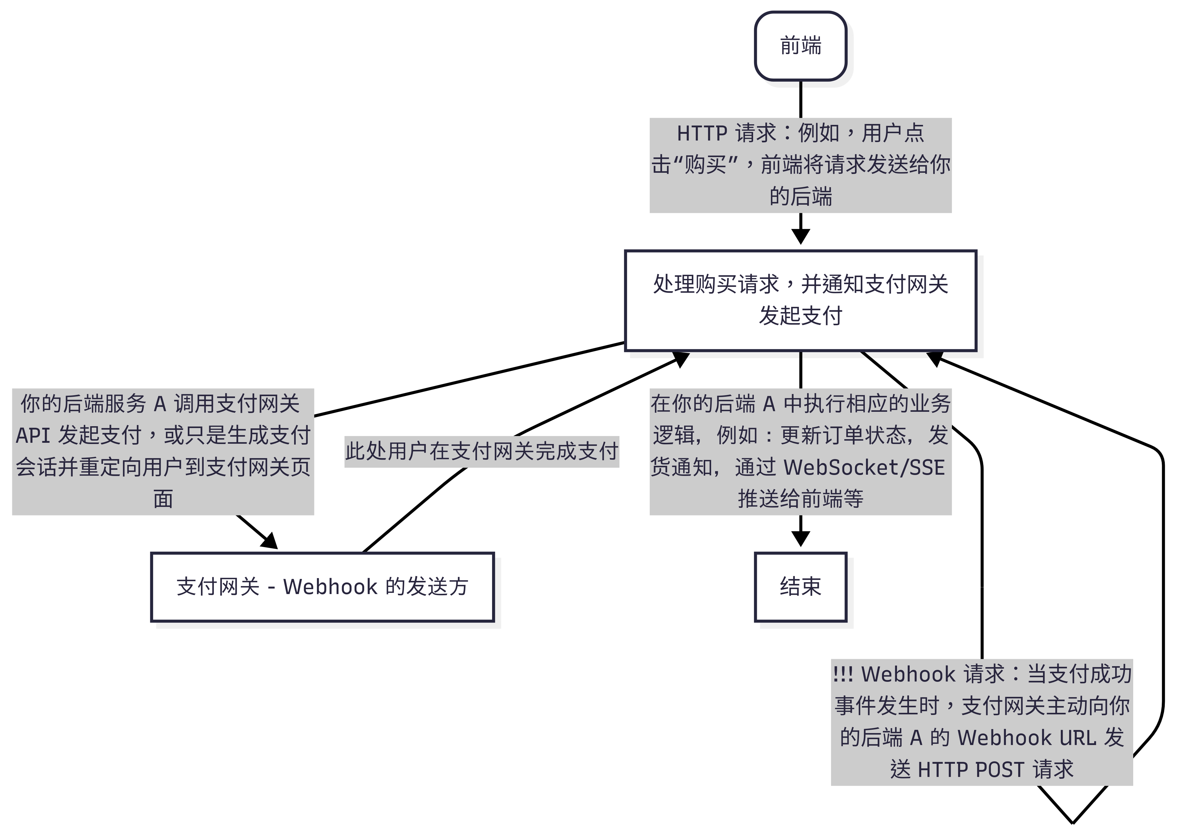 - 在 Webhook 中,支付网关调用的是你的后端服务 A 提供的“Webhook URL”。这个 URL 是你预先配置在支付网关那里的,告诉它“有事请通知我这个地址”。