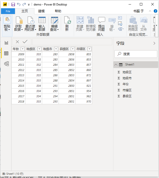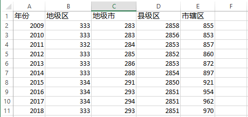 首先我们准备的测试数据是从国家统计局下载的近10年行政区域数据,见下表: