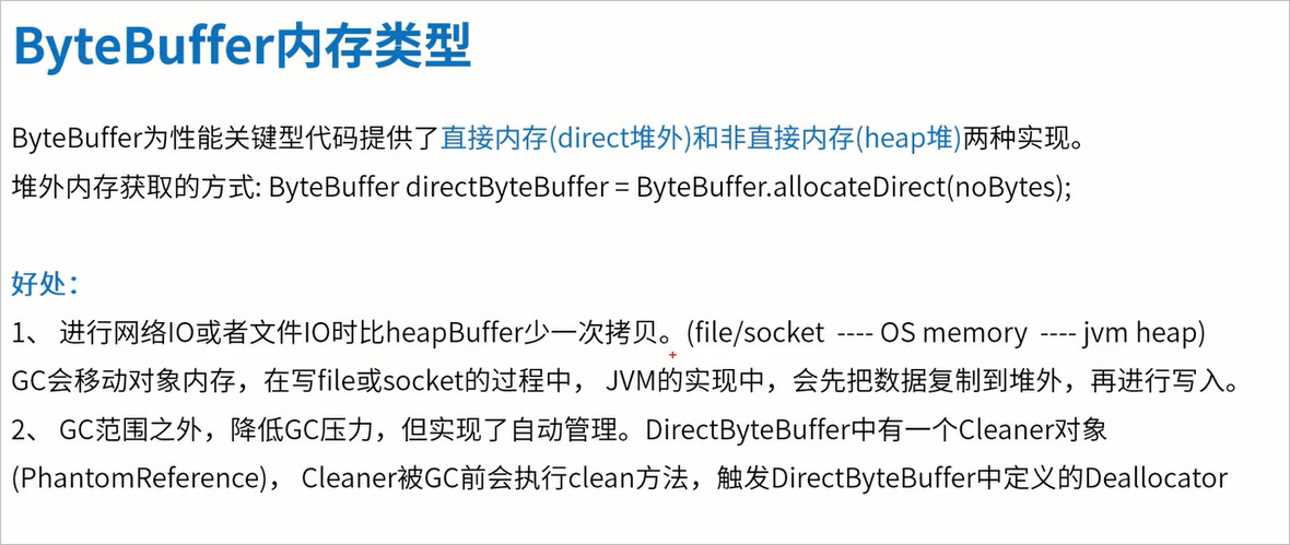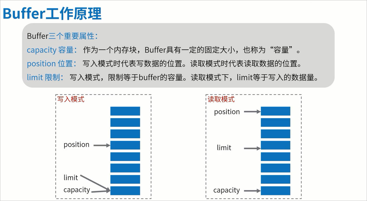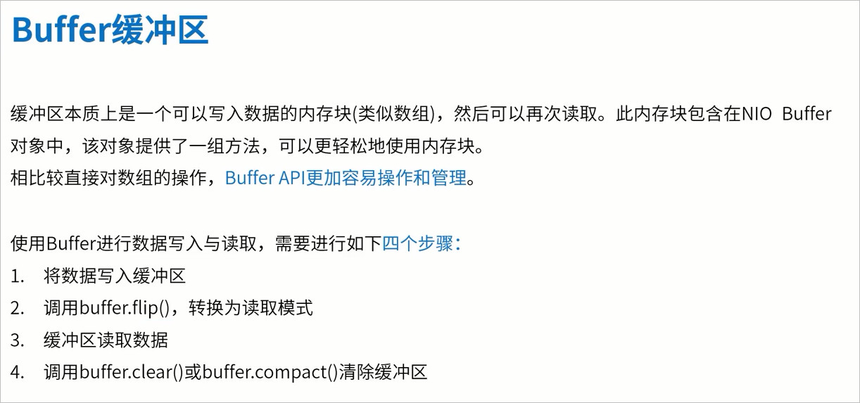 public class BufferDemo { public static void main(String[] args) { // 构建一个byte字节缓冲区,容量是4 ByteBuffer byteBuffer = ByteBuffer.allocateDirect(4); // 默认写入模式,查看三个重要的指标 System.out.println(String.format("初始化:capacity容量:%s, position位置:%s, limit限制:%s", byteBuffer.capacity(), byteBuffer.position(), byteBuffer.limit())); // 写入2字节的数据 byteBuffer.put((byte) 1); byteBuffer.put((byte) 2); byteBuffer.put((byte) 3); // 再看数据 System.out.println(String.format("写入3字节后,capacity容量:%s, position位置:%s, limit限制:%s", byteBuffer.capacity(), byteBuffer.position(), byteBuffer.limit())); // 转换为读取模式(不调用flip方法,也是可以读取数据的,但是position记录读取的位置不对) System.out.println("#######开始读取"); byteBuffer.flip(); byte a = byteBuffer.get(); System.out.println(a); byte b = byteBuffer.get(); System.out.println(b); System.out.println(String.format("读取2字节数据后,capacity容量:%s, position位置:%s, limit限制:%s", byteBuffer.capacity(), byteBuffer.position(), byteBuffer.limit())); // 继续写入3字节,此时读模式下,limit=3,position=2.继续写入只能覆盖写入一条数据 // clear()方法清除整个缓冲区。compact()方法仅清除已阅读的数据。转为写入模式 byteBuffer.compact(); // buffer : 1 , 3 byteBuffer.put((byte) 3); byteBuffer.put((byte) 4); byteBuffer.put((byte) 5); System.out.println(String.format("最终的情况,capacity容量:%s, position位置:%s, limit限制:%s", byteBuffer.capacity(), byteBuffer.position(), byteBuffer.limit())); // rewind() 重置position为0 // mark() 标记position的位置 // reset() 重置position为上次mark()标记的位置 } } /* 初始化:capacity容量:4, position位置:0, limit限制:4 写入3字节后,capacity容量:4, position位置:3, limit限制:4 #######开始读取 1 2 读取2字节数据后,capacity容量:4, position位置:2, limit限制:3 最终的情况,capacity容量:4, position位置:4, limit限制:4 */