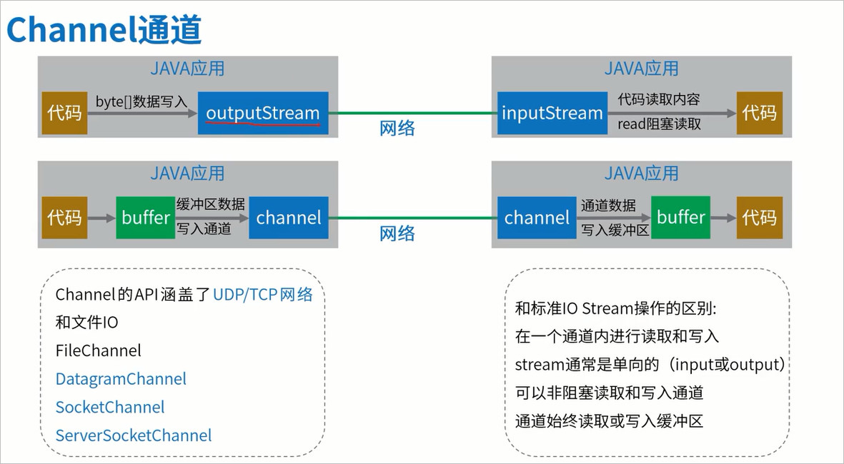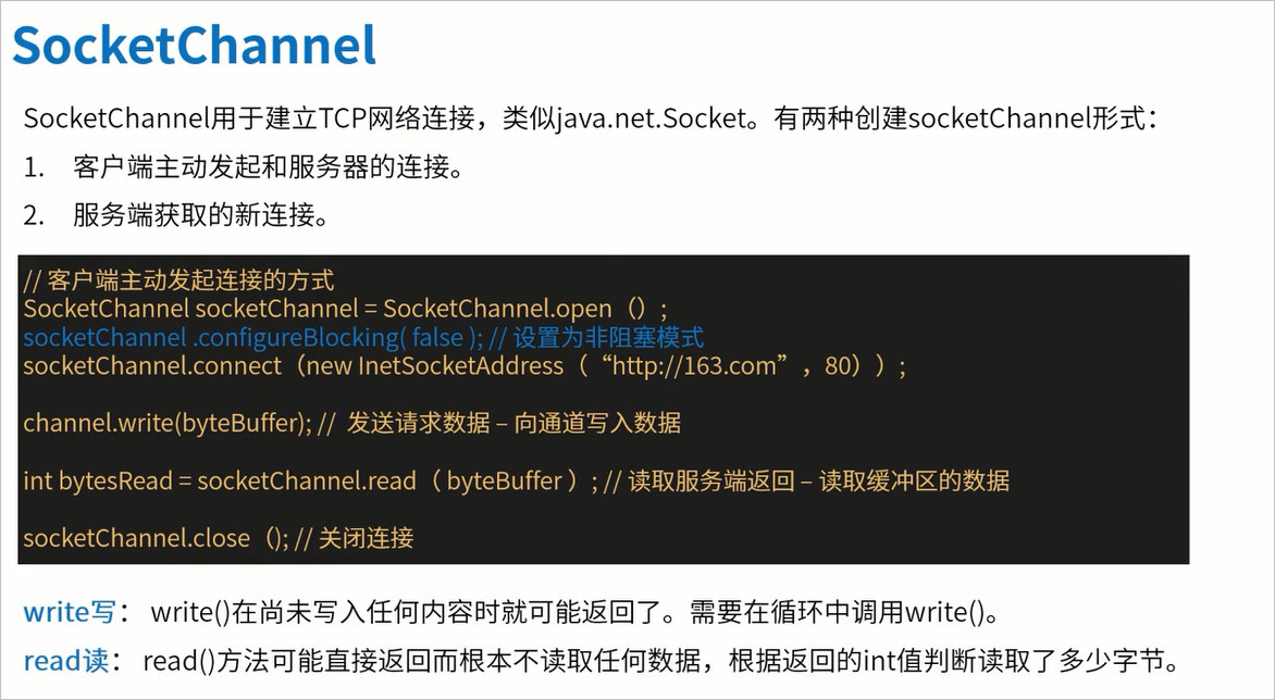 public class NIOClient { public static void main(String[] args) throws Exception { SocketChannel socketChannel = SocketChannel.open(); socketChannel.configureBlocking(false); socketChannel.connect(new InetSocketAddress("127.0.0.1", 8080)); while (!socketChannel.finishConnect()) { // 没连接上,则一直等待 Thread.yield(); } Scanner scanner = new Scanner(System.in); System.out.println("请输入:"); // 发送内容 String msg = scanner.nextLine(); ByteBuffer buffer = ByteBuffer.wrap(msg.getBytes()); while (buffer.hasRemaining()) { socketChannel.write(buffer); } // 读取响应 System.out.println("收到服务端响应:"); ByteBuffer requestBuffer = ByteBuffer.allocate(1024); while (socketChannel.isOpen() && socketChannel.read(requestBuffer) != -1) { // 长连接情况下,需要手动判断数据有没有读取结束 (此处做一个简单的判断: 超过0字节就认为请求结束了) if (requestBuffer.position() > 0) break; } requestBuffer.flip(); byte[] content = new byte[requestBuffer.limit()]; requestBuffer.get(content); System.out.println(new String(content)); scanner.close(); socketChannel.close(); } }