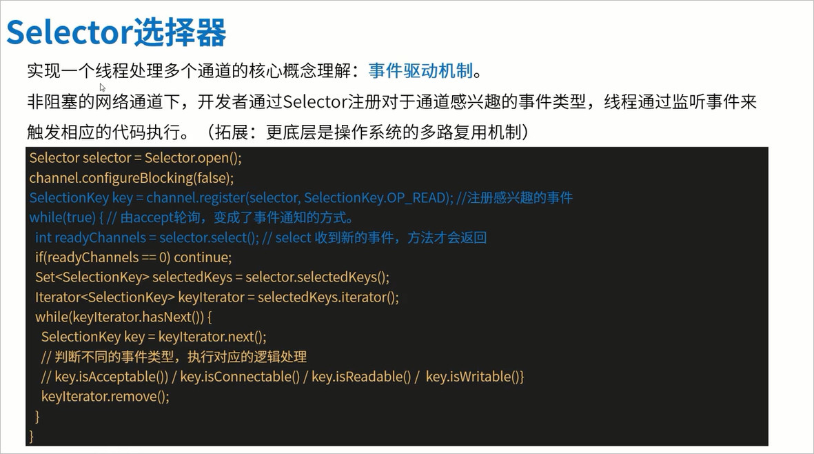 /** * 结合Selector实现的非阻塞服务端(放弃对channel的轮询,借助消息通知机制) */ public class NIOServerV2 { public static void main(String[] args) throws Exception { // 1. 创建网络服务端ServerSocketChannel ServerSocketChannel serverSocketChannel = ServerSocketChannel.open(); serverSocketChannel.configureBlocking(false); // 设置为非阻塞模式 // 2. 构建一个Selector选择器,并且将channel注册上去 Selector selector = Selector.open(); SelectionKey selectionKey = serverSocketChannel.register(selector, 0, serverSocketChannel);// 将serverSocketChannel注册到selector selectionKey.interestOps(SelectionKey.OP_ACCEPT); // 对serverSocketChannel上面的accept事件感兴趣(serverSocketChannel只能支持accept操作) // 3. 绑定端口 serverSocketChannel.socket().bind(new InetSocketAddress(8080)); System.out.println("启动成功"); while (true) { // 不再轮询通道,改用下面轮询事件的方式.select方法有阻塞效果,直到有事件通知才会有返回 selector.select(); // 获取事件 Set<SelectionKey> selectionKeys = selector.selectedKeys(); // 遍历查询结果e Iterator<SelectionKey> iter = selectionKeys.iterator(); while (iter.hasNext()) { // 被封装的查询结果 SelectionKey key = iter.next(); iter.remove(); // 关注 Read 和 Accept两个事件 if (key.isAcceptable()) { ServerSocketChannel server = (ServerSocketChannel) key.attachment(); // 将拿到的客户端连接通道,注册到selector上面 SocketChannel clientSocketChannel = server.accept(); // mainReactor 轮询accept clientSocketChannel.configureBlocking(false); clientSocketChannel.register(selector, SelectionKey.OP_READ, clientSocketChannel); System.out.println("收到新连接 : " + clientSocketChannel.getRemoteAddress()); } if (key.isReadable()) { SocketChannel socketChannel = (SocketChannel) key.attachment(); try { ByteBuffer requestBuffer = ByteBuffer.allocate(1024); while (socketChannel.isOpen() && socketChannel.read(requestBuffer) != -1) { // 长连接情况下,需要手动判断数据有没有读取结束 (此处做一个简单的判断: 超过0字节就认为请求结束了) if (requestBuffer.position() > 0) break; } if(requestBuffer.position() == 0) continue; // 如果没数据了, 则不继续后面的处理 requestBuffer.flip(); byte[] content = new byte[requestBuffer.limit()]; requestBuffer.get(content); System.out.println(new String(content)); System.out.println("收到数据,来自:" + socketChannel.getRemoteAddress()); // TODO 业务操作 数据库 接口调用等等 // 响应结果 200 String response = "HTTP/1.1 200 OK\r\n" + "Content-Length: 11\r\n\r\n" + "Hello World"; ByteBuffer buffer = ByteBuffer.wrap(response.getBytes()); while (buffer.hasRemaining()) { socketChannel.write(buffer); } } catch (IOException e) { // e.printStackTrace(); key.cancel(); // 取消事件订阅 } } } selector.selectNow(); } // 问题: 此处一个selector监听所有事件,一个线程处理所有请求事件. 会成为瓶颈! 要有多线程的运用 } }