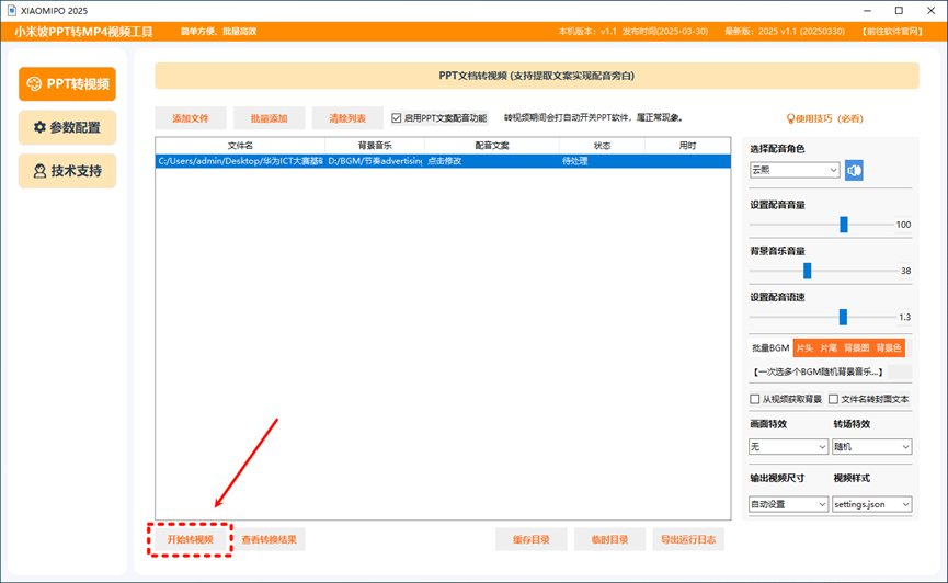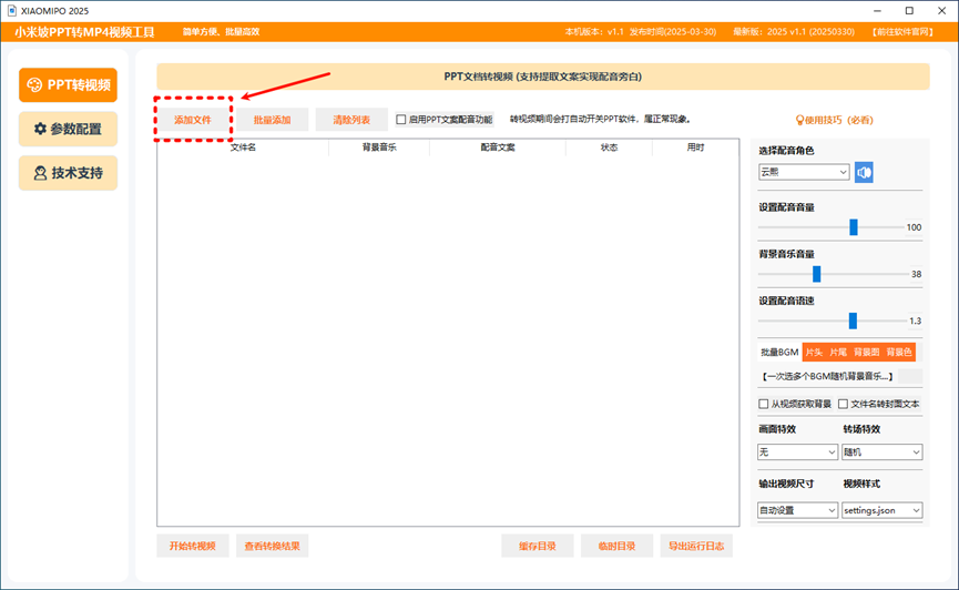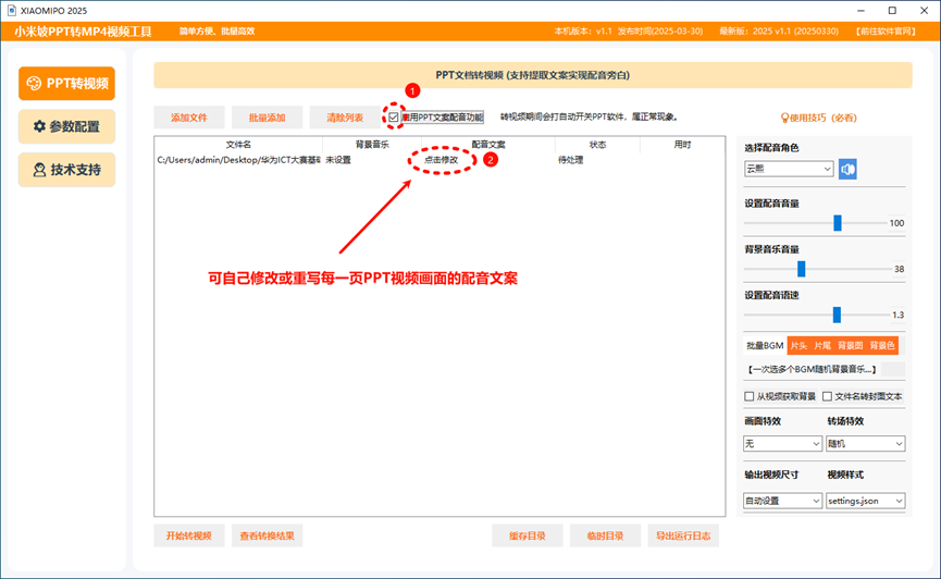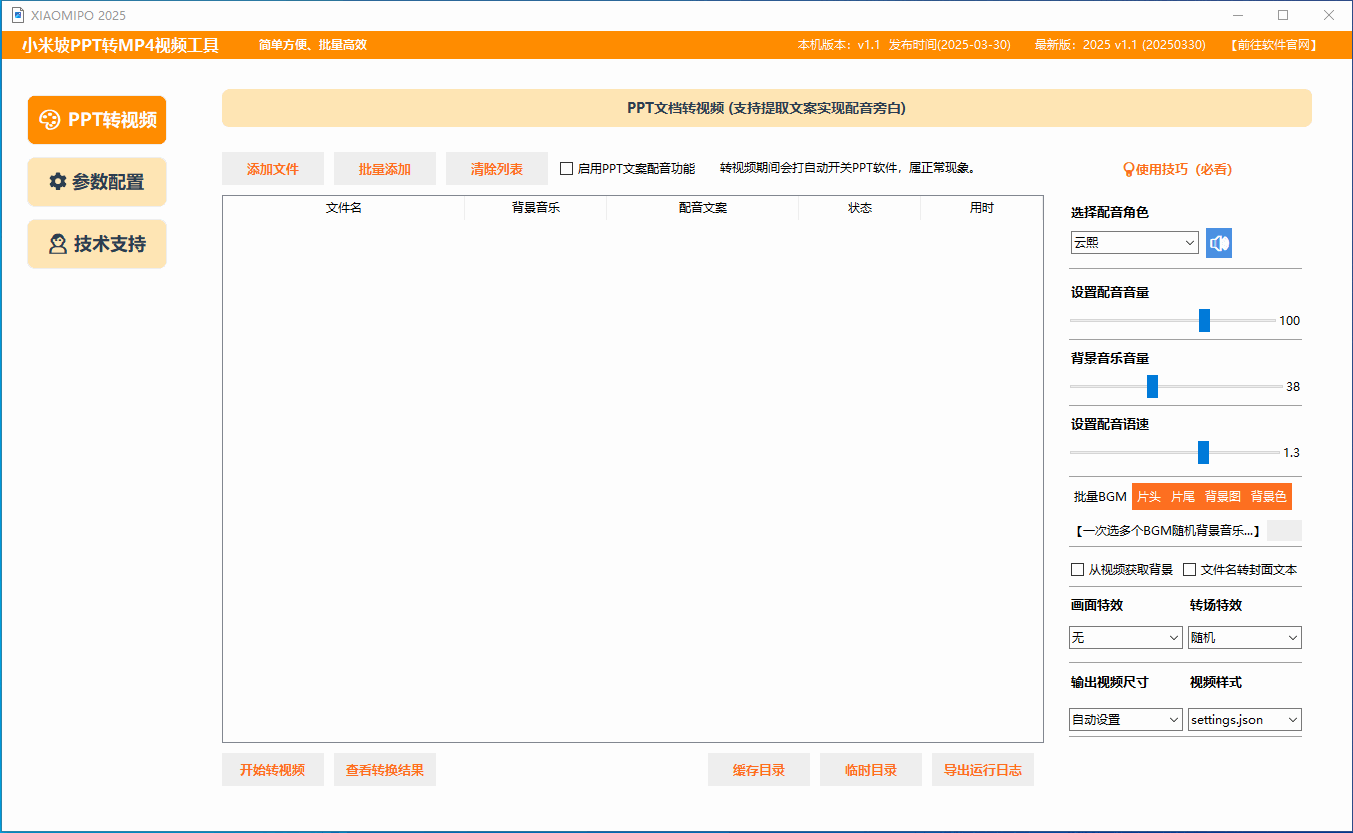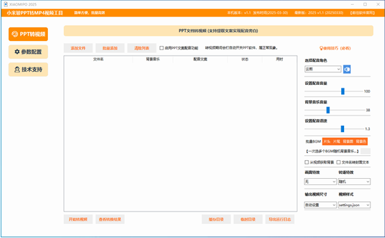 小米坡PPT转MP4视频工具是一款可把微软powerpoint文档转换成视频文件的工具,能够自动配音旁白,自动背景音乐,支持人工二次修改调整配音文案。