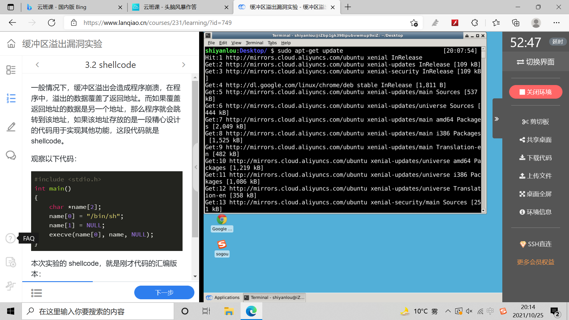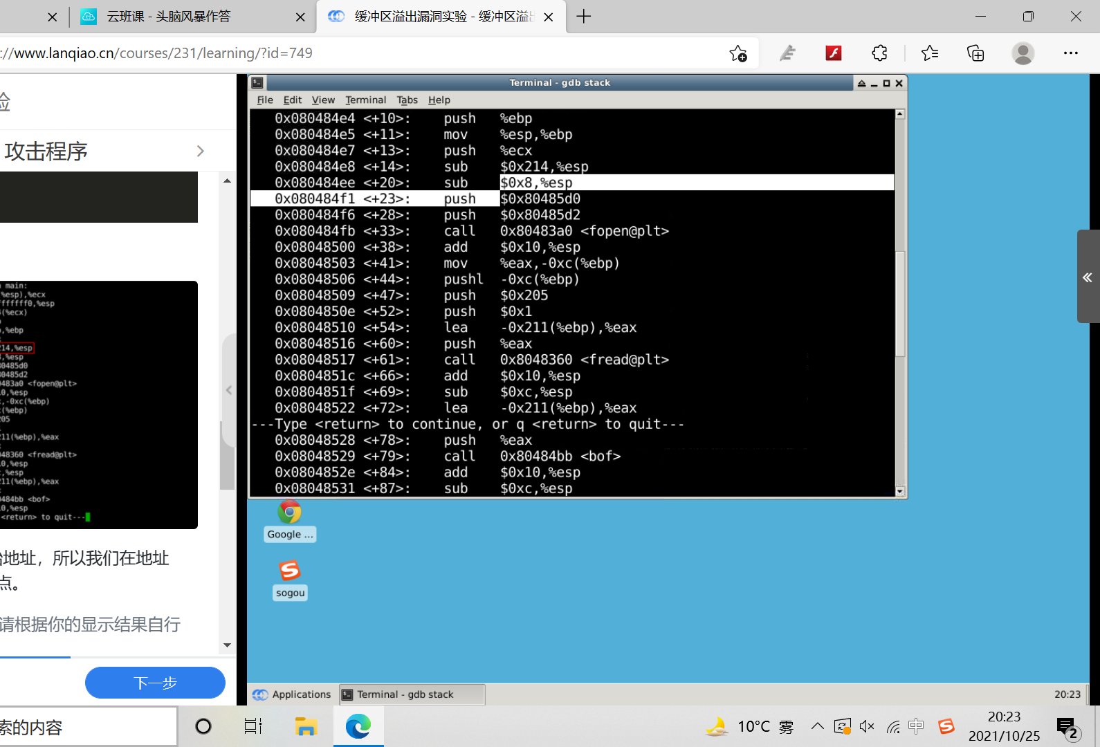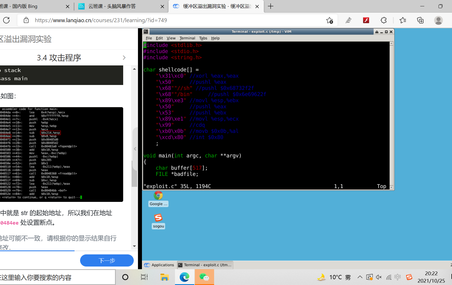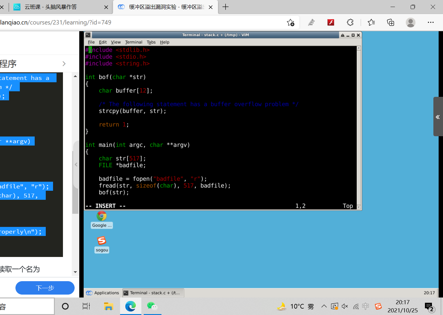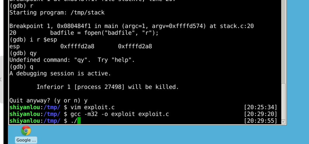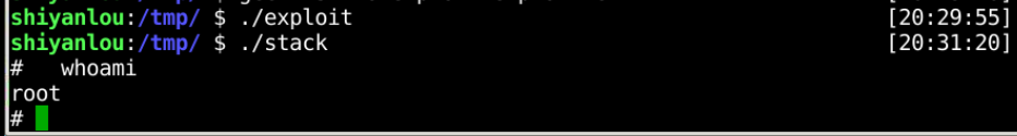 编译 exploit.c 程序,再运行攻击程序 exploit,再运行漏洞程序 stack: