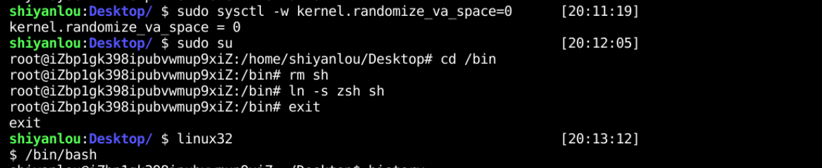 关闭地址随机化后,linux 系统中,/bin/sh 实际是指向 /bin/bash 或 /bin/dash 的一个符号链接。为了重现这一防护措施被实现之前的情形,我们要使用另一个 shell 程序(zsh)代替 /bin/bash,并在32位环境中使用bash: