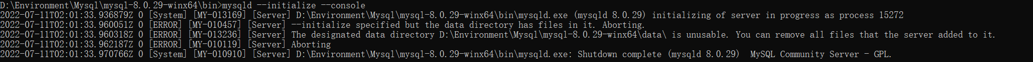 5. 切换到 mysql 的 bin 目录下,重新执行 mysqld --install 命令后执行初始化 Mysql命令,发现又错了,看描述应该是原来的 data 文件夹数据没清理干净。于是清理即可。