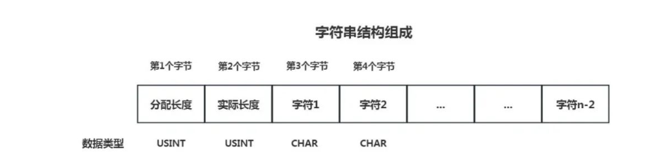 string一般针对ASCII编码格式,是以字符(char)数组的形式表示,最大空间是256字节。第一和第二字节记录的是分配长度和实际长度,所以实际的数据有效长度是254字节。