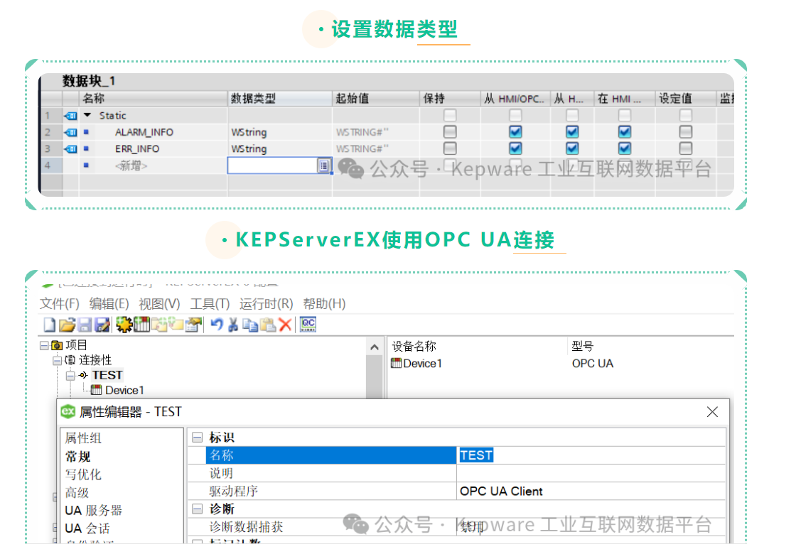 这样需要在PLC中开启OPC UA接口,并且将中文字符串数据类型改为wstring,在KEPServerEX中通过OPC UA Client驱动进行读取