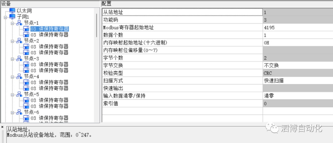 根据软启动器和马达保护器的Modbus通信点表,使用TS-123软件对网关做对应配置,部分配置截图如下: