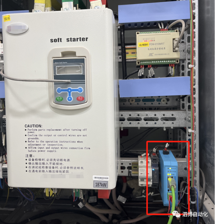 该系统中,S7-1515PLC支持PROFINET以太网协议,软启动器和马达保护器支持Modbus RTU协议,为了搭建PLC与软启和马达保护器的通信,实现中控室实时采集、分析软启和马达保护器工作参数等信息,确保电机的正常运行,客户选择上海泗博----Modbus转PROFINET网关TS-180作为该通信的解决方案。