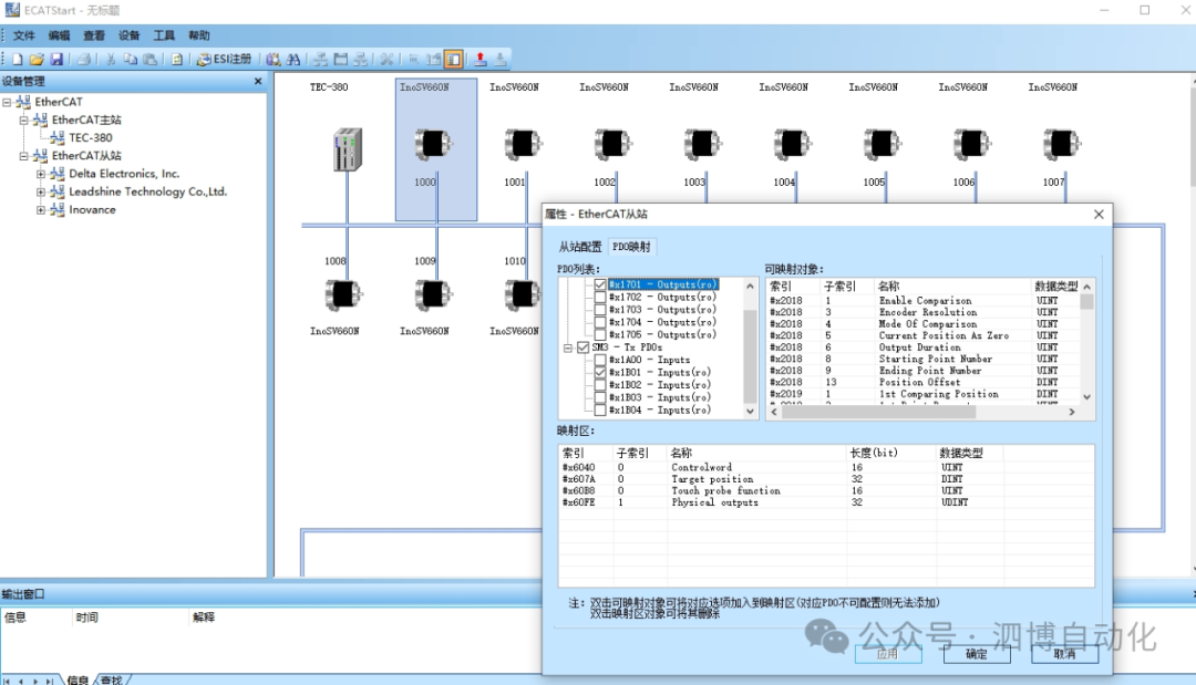 导入汇川SV660N的ESI(*xml)文件,使用ECATStart软件对网关做对应配置,部分配置截图如下: