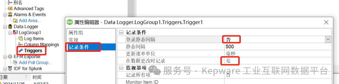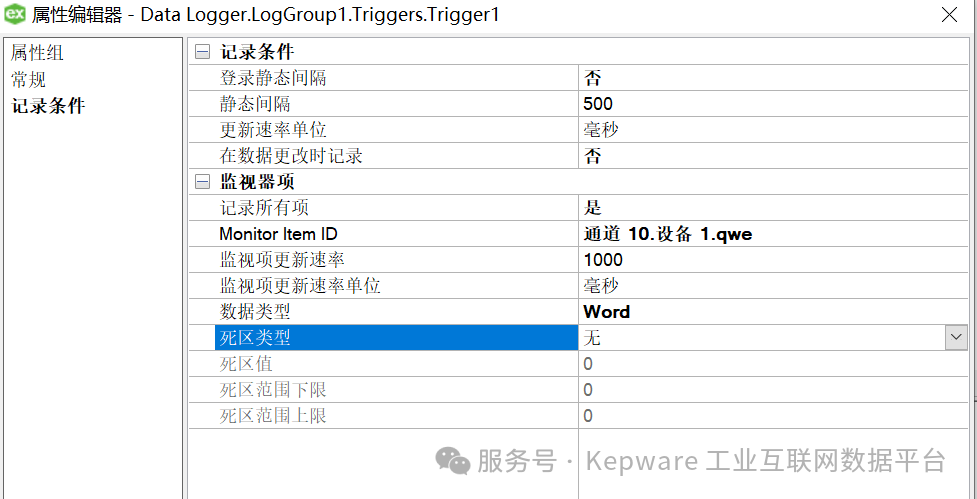 还是在刚才的位置,将“登录静态间隔”和“在数据更改时记录”都设置为“否”,然后将“监视器项”中的记录所有项改为“是”。选择要监视的Tag点,这样当这个Tag点数据发生变化就会将所有数据进行存储。考虑到数据波动还可以设置死区来保证数据有效变化再进行存储。