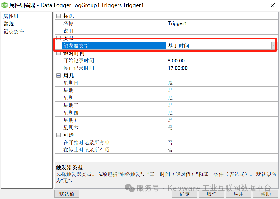 将Triggers的“触发器类型”选择为“基于时间”,就可以设置开始记录时间和停止记录时间,每周几记录都可以设置了。