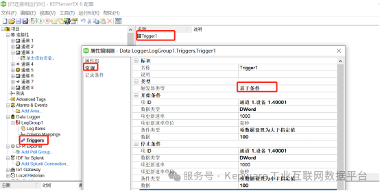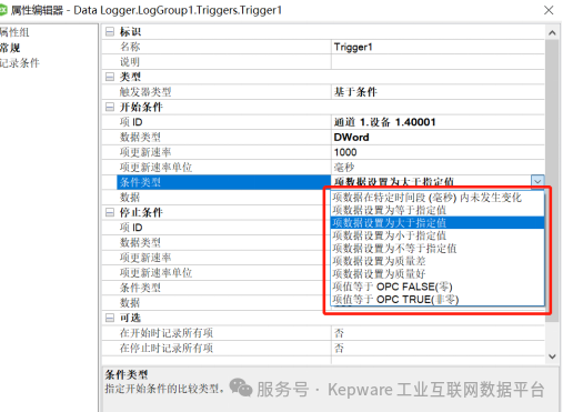 在Triggers里面将“触发器类型”设置为“基于条件”,这样就可以选择某一个触发点,通过判断这个点的值或者状态来进行触发存储。