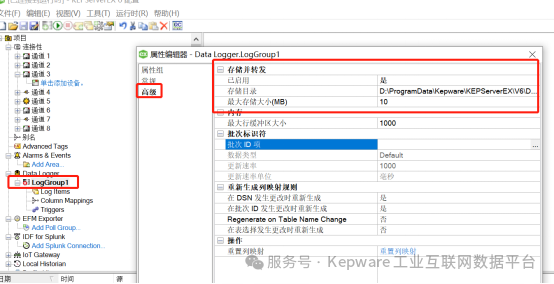我们可以在LogGroup里面设置启用存储转发,这样当Kepware与数据库的连接断开后,会先将数据存储在本地路径下,当与数据库的连接恢复后再将存储的数据给到数据库,保障数据的完整性。