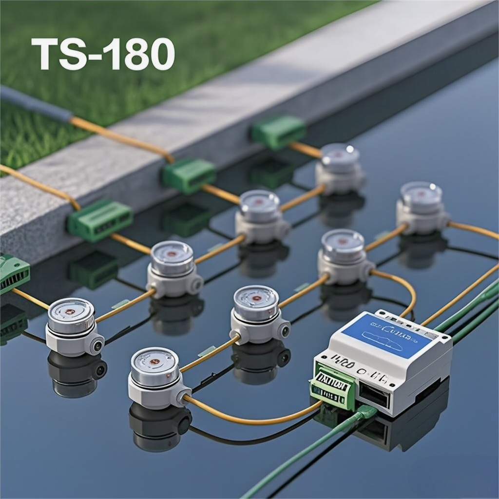设备连接:每台TS-180通过RS485串口连接多台智能水表,再通过以太网口级联至PLC网络。