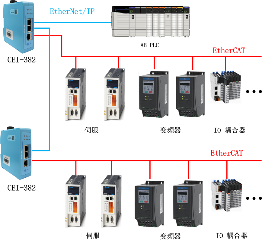 1.使用CEI-382连接和利时伺服,将网关ECAT口与伺服的ECAT接口的IN口连接。EtherNet/IP口与AB PLC处在一个局域网下;