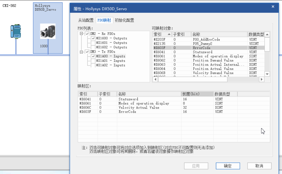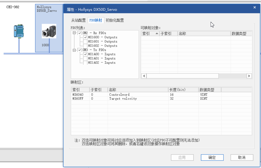 伺服PDO映射中选择Control word 6040H与Target velocity 60FFH