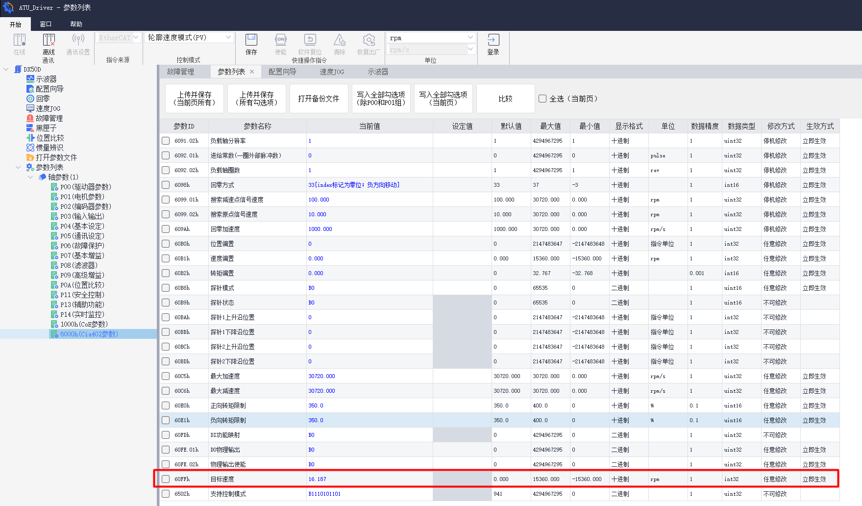 设置 Target velocity(60FFh),伺服使能 ON 状态,设置目标速度后会立即执行