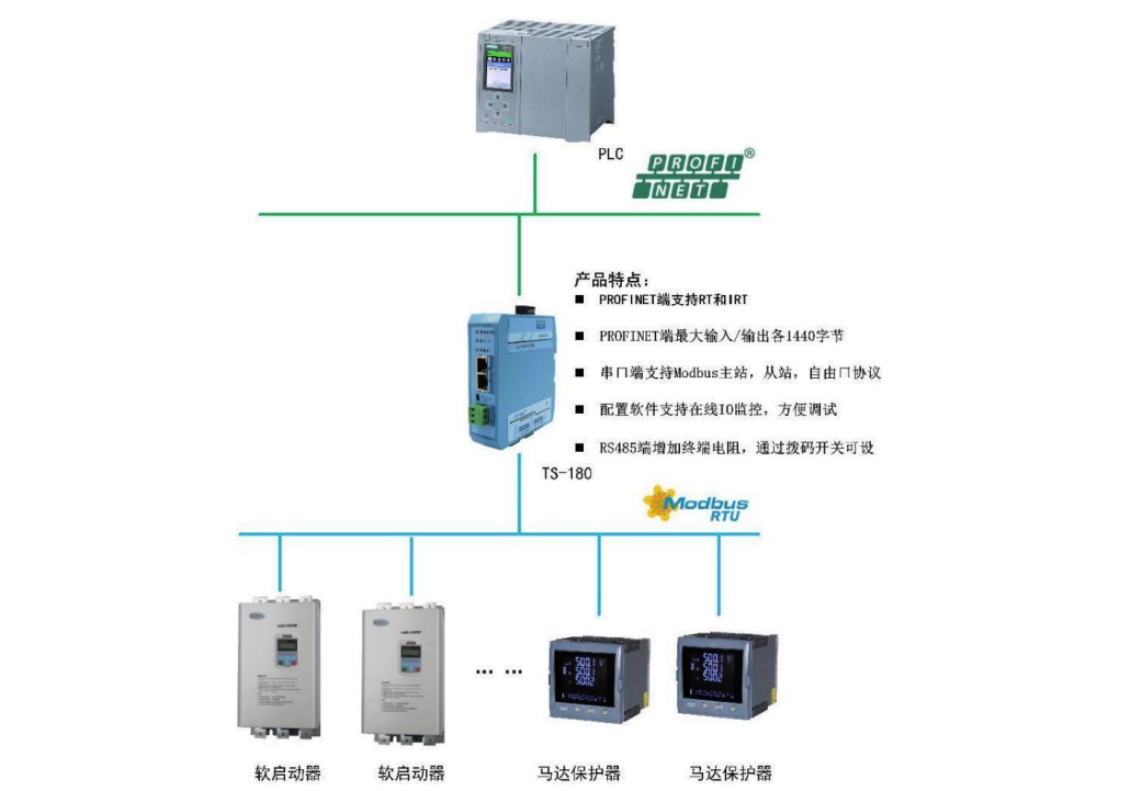 该系统中,S7-1515PLC 支持 PROFINET 以太网协议,软启动器和马达保护器支持Modbus RTU协议,为了搭建 PLC 与软启和马达保护器的通信,实现中控室实时采集、分析软启和马达保护器工作参数等信息,确保电机的正常运行,客户选择上海泗博----Modbus 转 PROFINET 网关TS-180作为该通信的解决方案。