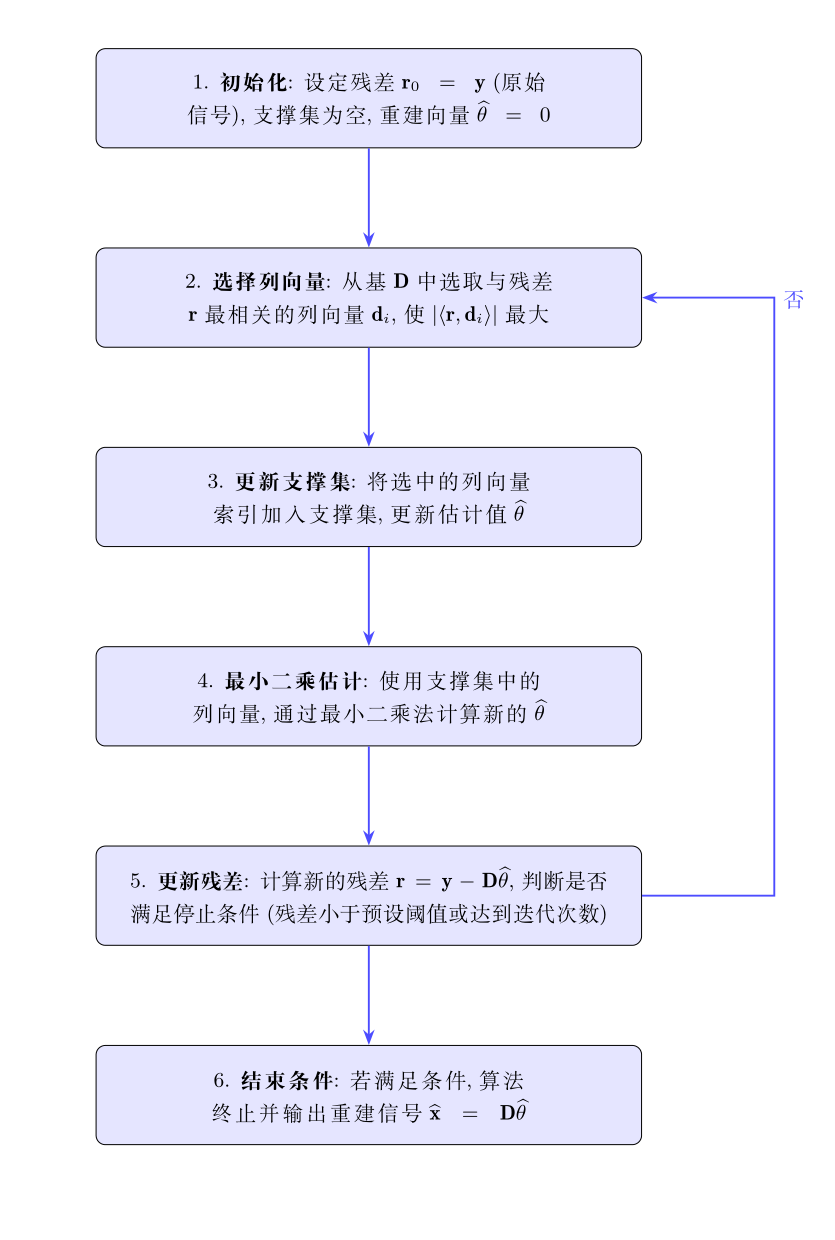 首先设定残差 \(\mathbf{r}_0 = \mathbf{y}\)(原始信号),初始化支撑集为空,重建向量 \(\mathbf{\hat{\theta}}\) 为零向量。并在每次迭代中,选择基 \(\mathbf{D}\) 中与残差 \(\mathbf{r}\) 最相关的列向量 \(\mathbf{d}_i\)。该向量使得 \(|\langle \mathbf{r}, \mathbf{d}_i \rangle|\) 最大。进而将选中的列向量的索引加入支撑集,同时更新估计值 \(\mathbf{\hat{\theta}}\)。利用当前支撑集中的列向量,通过最小二乘法计算新的估计向量 \(\mathbf{\hat{\theta}}\)。计算新的残差 \(\mathbf{r} = \mathbf{y} - \mathbf{D} \mathbf{\hat{\theta}}\),判断是否满足停止条件(如残差小于预设阈值或迭代次数达到限制)。该算法在残差足够小或支撑集达到预设稀疏度时终止,最终输出重建信号 \(\mathbf{\hat{x}} = \mathbf{D} \mathbf{\hat{\theta}}\)。
