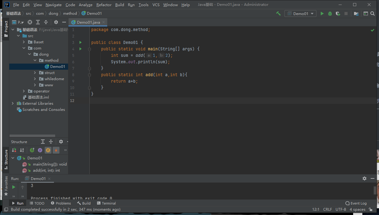 设计方法的原则:方法的本意是功能块,就是实现某个功能的语句块的集合。我们设计方法的时候,最好保持方法的原子性,就是一个方法只完成1个功能,这样利于我们后期的扩展。