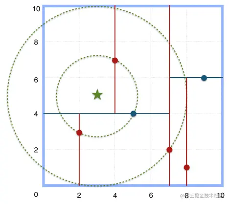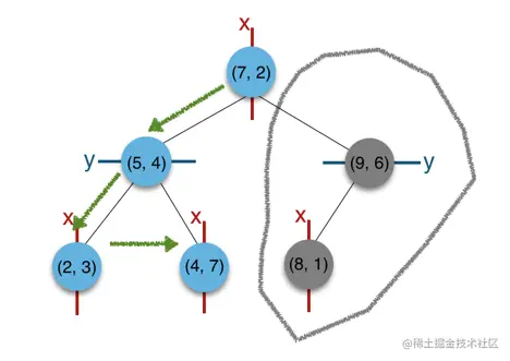 - 首先从根节点出发,将根节点设为最近邻,对tree进行深度优先遍历。以(3, 5)为圆心,到(7,2)的距离为半径做圆,可以看出(8,1)右侧的空间与该圆不相交,所以这个子树被剪枝。