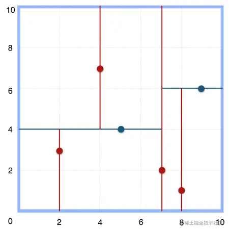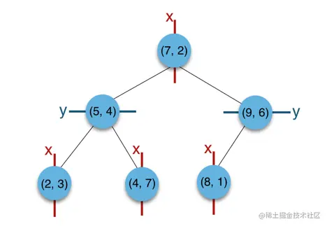 这样一个空间,以(7, 2)处为根节点,分别以X轴,Y轴,X轴为划分维度,划分结果是: