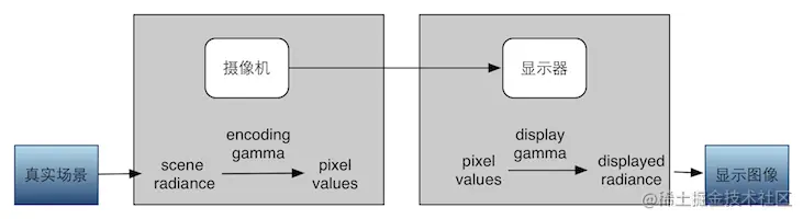 下图是真实场景产生图像到显示器显示图像的完整流程,如果想要显示器显示的图像与看到的真实场景完全一样,保证viewinggamma为1就可以了。