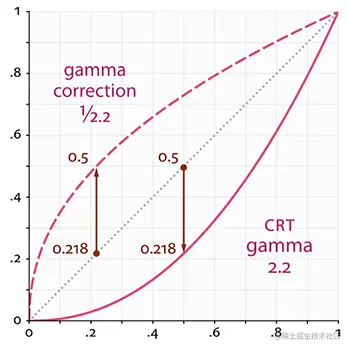 可以这样处理,按照人眼的亮度感受曲线,把真实亮度编码之后,再存储到贴图上,理论上图片的质量比之前更好了。这个编码我们叫它Encoding Gamma。 处理公式可以近似成: