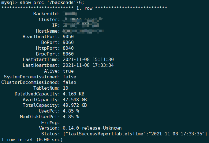 (4)DECOMMISSION 的进度,可以通过 SHOW PROC '/backends'; 中的 TabletNum 查看,如果正在进行,TabletNum 将不断减少。