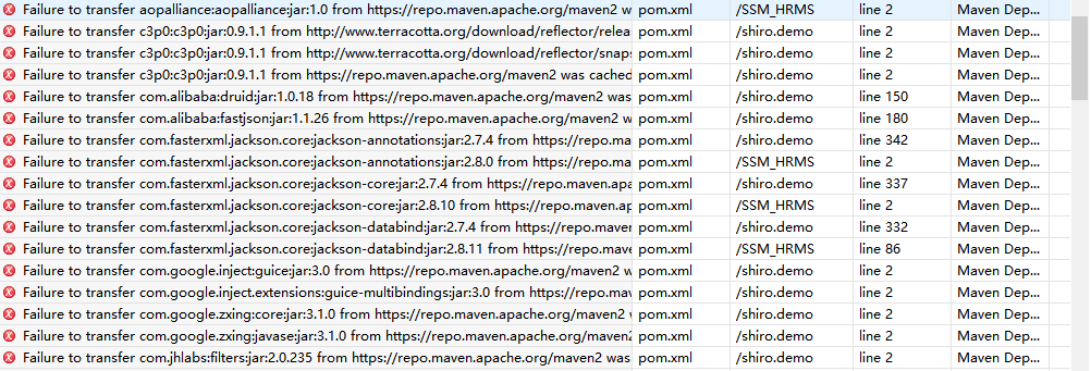 是因为maven本地仓库没有这个jar,而网速太慢没有下载,这时候可以右键项目->run as->maven install会重新下载这些jar,然后再update一下。