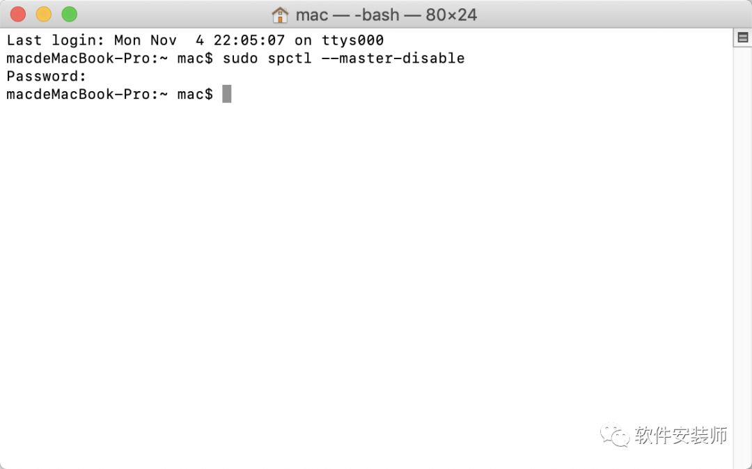 1.在终端里面输入【sudo spctl --master-disable】然后按回车键;