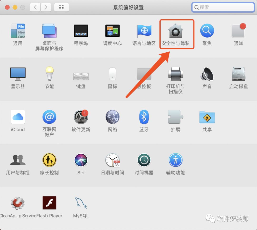 3.然后选择【系统偏好设置】。选择【安全性和隐私】。