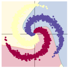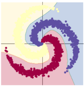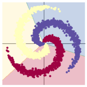 由于数据的分布是呈螺旋状的,线性分类必然无法准确区分数据
