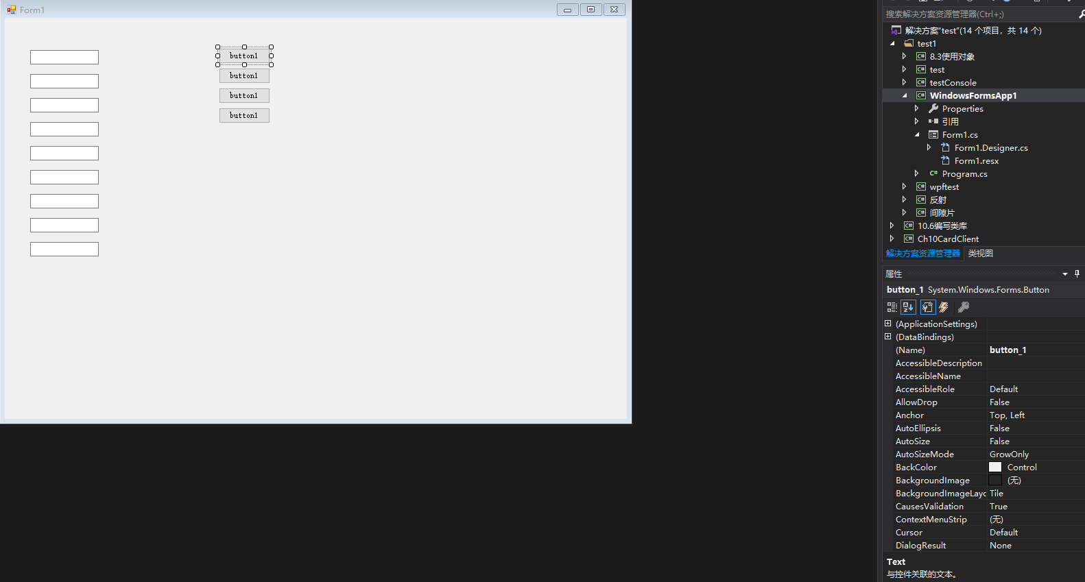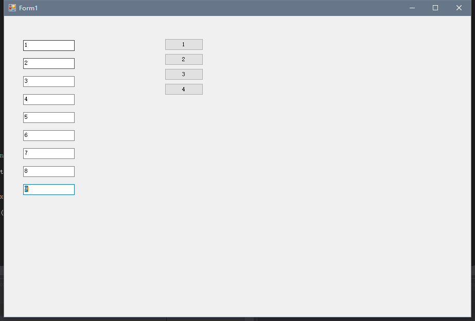 using System; using System.Collections.Generic; using System.ComponentModel; using System.Data; using System.Drawing; using System.Linq; using System.Text; using System.Windows.Forms; namespace WindowsFormsApp1 { public partial class Form1 : Form { public Form1() { InitializeComponent(); } private void Form1_Load(object sender, EventArgs e) { Control.ControlCollection t = this.Controls;//Controls foreach (Control item in t) { if (item.GetType().Name.Equals("TextBox")) { string[] str = item.Name.Split('_'); if (str.Length > 1) { item.Text = str[1]; } } if (item is TextBox) { string[] str = item.Name.Split('_'); if (str.Length > 1) { item.Text = str[1]; } } if (item is Button) { string[] str = item.Name.Split('_'); if (str.Length > 1) { item.Text = str[1]; } } } } } }