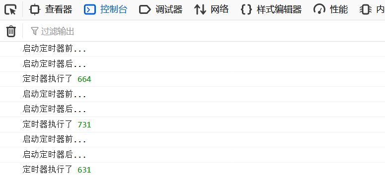 <!DOCTYPE html> <html lang="en"> <head> <meta charset="UTF-8"> <title></title> </head> <body> <button id="btn">启动定时器</button> <script type="text/javascript"> document.getElementById('btn').onclick = function () { var start = Date.now() console.log('启动定时器前...') setTimeout(function () { console.log('定时器执行了', Date.now()-start) }, 200) console.log('启动定时器后...') // 做一个长时间的工作 for (var i = 0; i < 1000000000; i++) { } } </script> </body> </html>
