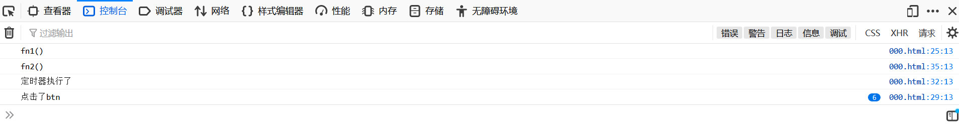 <!DOCTYPE html> <html lang="en"> <head> <meta charset="UTF-8"> <title></title> </head> <body> <button id="btn">测试</button> <script type="text/javascript"> function fn1() { console.log('fn1()') } fn1() document.getElementById('btn').onclick = function () { console.log('点击了btn') } setTimeout(function () { console.log('定时器执行了') }, 2000) function fn2() { console.log('fn2()') } fn2() </script> </body> </html>