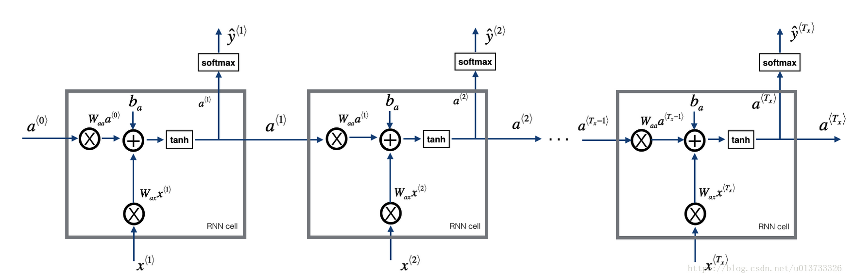 # Waa -- 权重矩阵乘以隐藏状态,维度为(n_a, n_a)