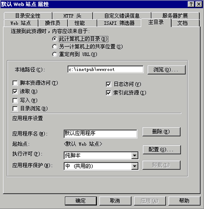 打开IIS的管理控制台,又键单击站点,选择"属性",跳出站点的属性对话框。选择主目录选项。如图3