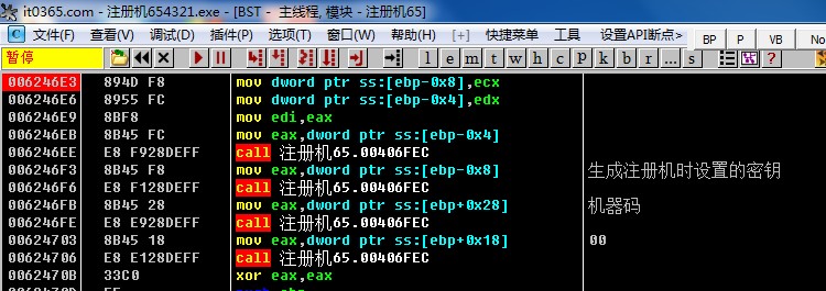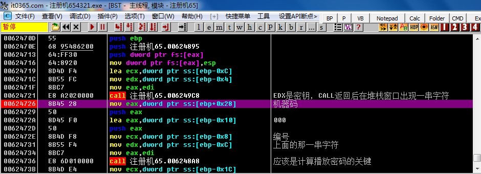 而 00624736 E8 6D010000 call 注册机65.006248A8 ; 应该是计算播放密码的关键 就是将机器码,编号,密钥带入生成播放密码的。
