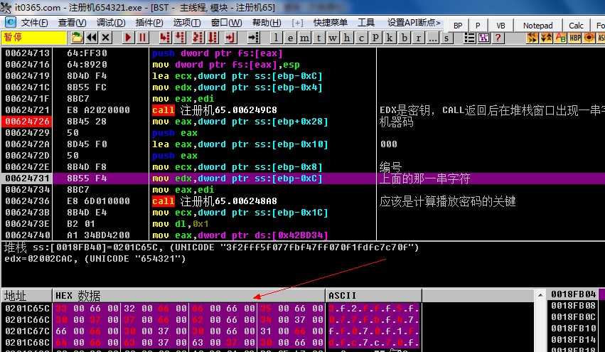 这部分 00624721 E8 A2020000 call 注册机65.006249C8 ; EDX是密钥,CALL返回后在堆栈窗口出现一串字符 经过跟踪发现是将明密钥内容经过加密后生成一串16位的字符串。具体算法也很简单,大家有兴趣去跟下。
