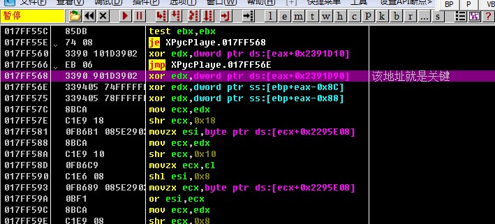 017FF55C 85DB test ebx,ebx 017FF55E 74 08 je XPycPlaye.017FF568 017FF560 3390 101D3902 xor edx,dword ptr ds:[eax+0x2391D10] 017FF566 EB 06 jmp XPycPlaye.017FF56E 017FF568 3390 901D3902 xor edx,dword ptr ds:[eax+0x2391D90] ; 该地址就是关键 017FF56E 339405 74FFFFFF xor edx,dword ptr ss:[ebp+eax-0x8C];by simont QQ1462109921 017FF575 339405 78FFFFFF xor edx,dword ptr ss:[ebp+eax-0x88] 017FF57C 8BCA mov ecx,edx 017FF57E C1E9 18 shr ecx,0x18 017FF581 0FB6B1 085E2902 movzx esi,byte ptr ds:[ecx+0x2295E08] 017FF588 8BCA mov ecx,edx 017FF58A C1E9 10 shr ecx,0x10 017FF58D 0FB6C9 movzx ecx,cl