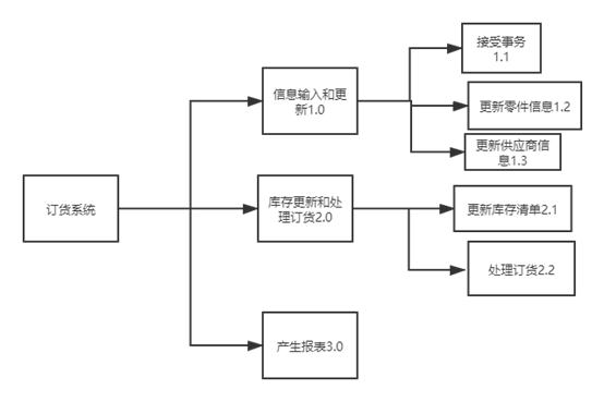 系统:订货系统 模块:信息输入和更新 编号1.0 被调用:订货系统 调用:接受事务、更新零件信息、更新供应商信息 输入:事务、零件信息、供应商信息 输出:事务、零件信息、供应商信息 处理:接收从CRT终端输入的书屋信息并将事务信息存储到数据库中:接收从CRT终端输入的零件信息或供应商信息、更新数据库中的零件信息或者供应商信息。 数据元素:零件名称、零件编号、事务类型、事务编号、时间、数量、目前价格、供应商名称、供应商编号、收获途径 |