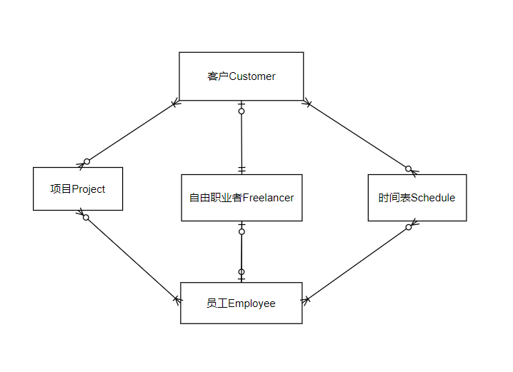 实体 属性 自由职业者Freelancer 编号fid,姓名name,年龄age,工作job,地址addr,电话phone,微信wechat,邮箱mail 客户Customer 编号cid,姓名name,年龄age,工作job,地址addr,电话phone,微信wechat,邮箱mail 员工Employee 编号eid,姓名name,年龄age,工作job,地址addr,电话phone,微信wechat,邮箱mail 时间表Schedule 编号sid,员工编号eid,客户编号cid,开始时间start,结束时间end 项目Project 编号pid,项目名称pname,项目内容pcontent,项目时间ptime -