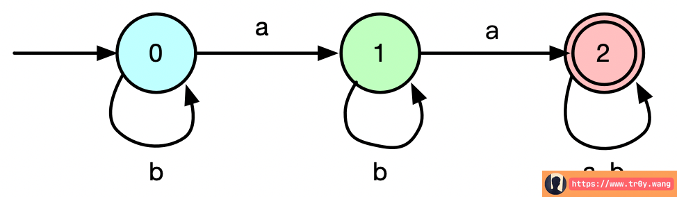 我们再详细地看它的转移函数,每个状态,遇到特定的一个输入,都只有一个路线可以走,那么这种状态机就叫做 DFA(确定状态有限状态自动机) 。