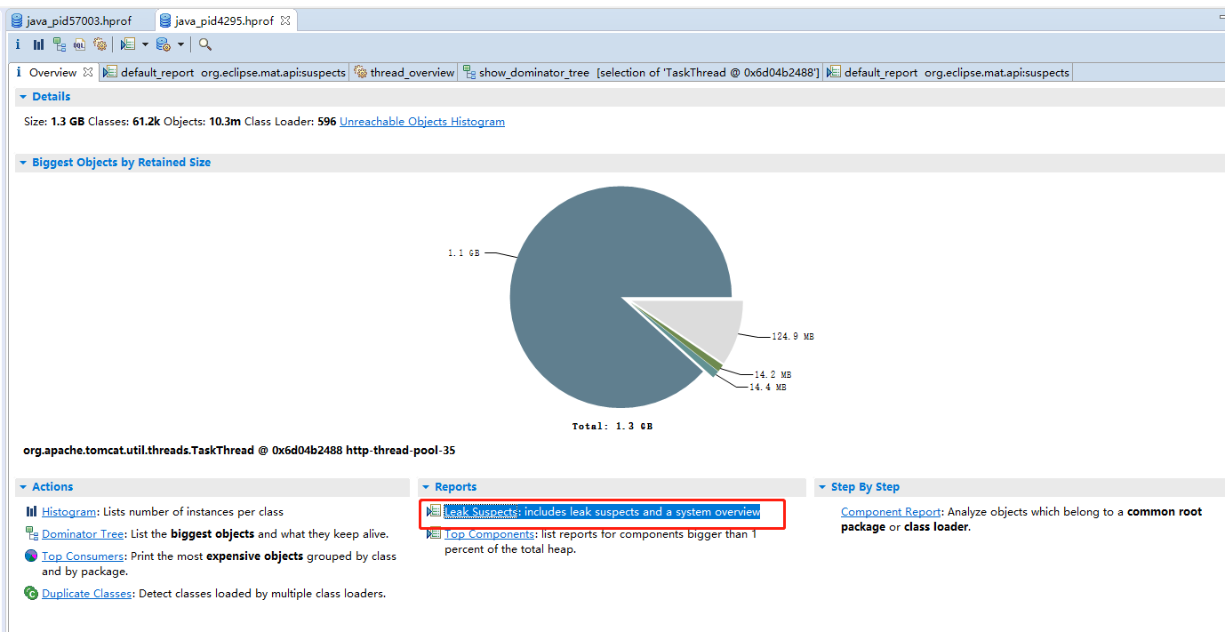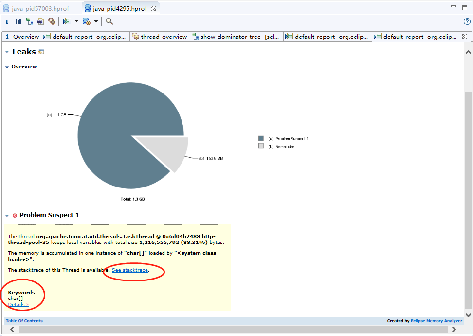 经过现场发来的dump文件发现,eclipse memory analyzer自动帮我们发现了可疑的泄漏点(我的方式,thread_overview->JAVA Basics->dominator tree)