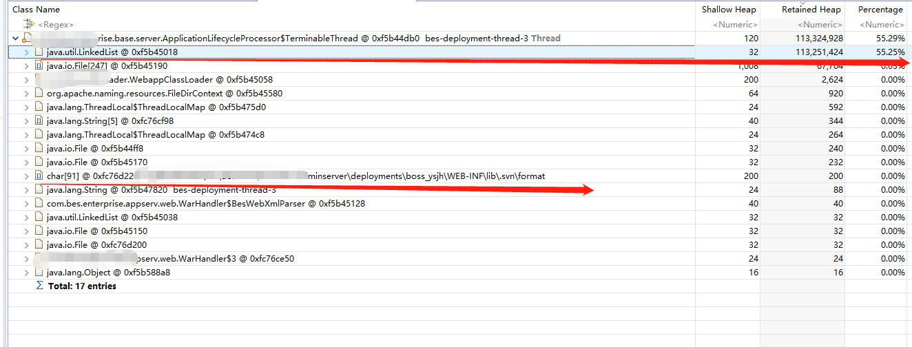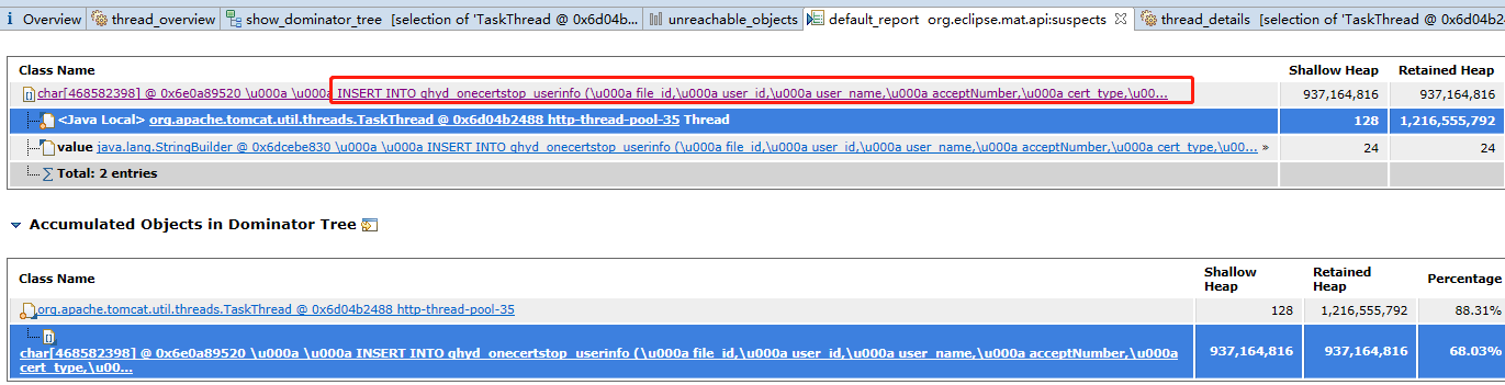 thread-pool-35线程 这个char[]对象占据了总大小的88.31%,总共是
