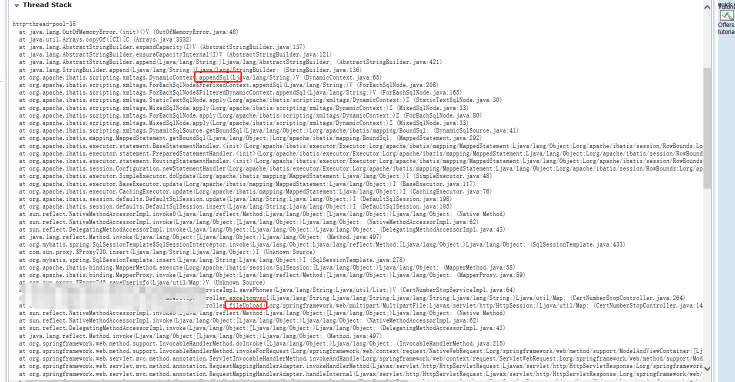 经过分析,原因是在页面点击文件上传时,由于Mybatis 批量插入了庞大的数据量,导致内存使用增加,才会出现这个问题引发的内存溢出